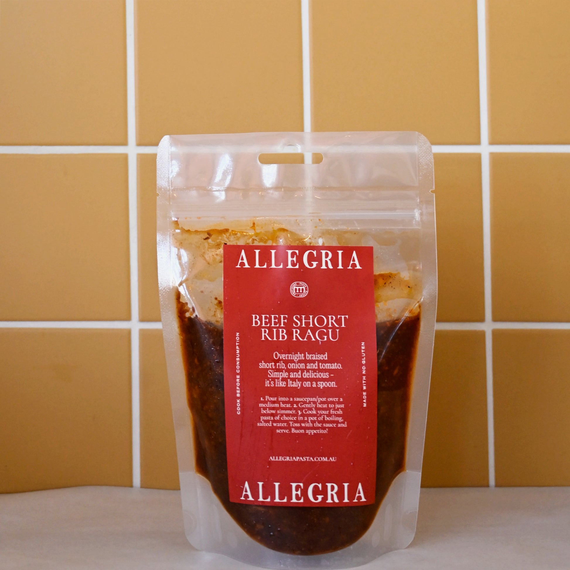 Beef short rib, chicken stock (water, free-range chicken bones, onion, carrot, celery, garlic, thyme), onion, red wine, tomato, olive oil, garlic, oregano, basil, bay leaves, salt, pepper, water.